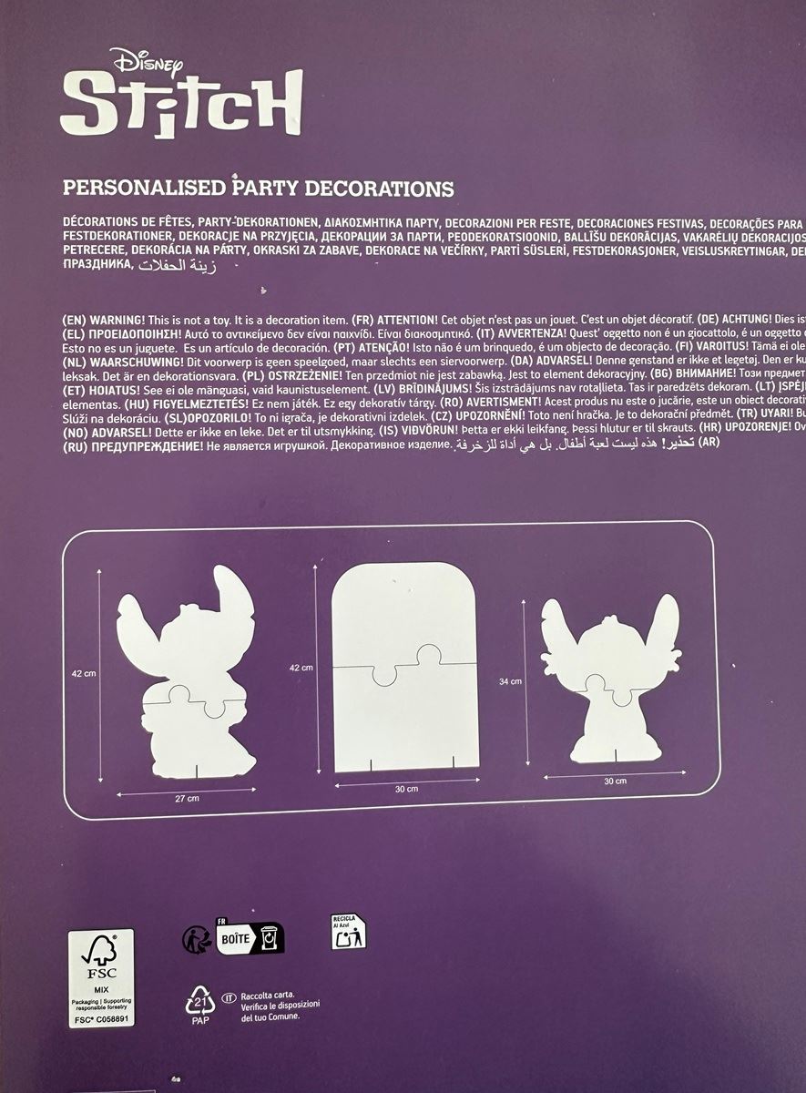 El cartel Stitch personalizable con figuras decorativas es una decoración perfecta para crear un ambiente divertido en fiestas infantiles temáticas de Stitch. Incluye un cartel central donde se puede escribir el nombre del protagonista de la fiesta y dos figuras decorativas de Stitch para completar la decoración.