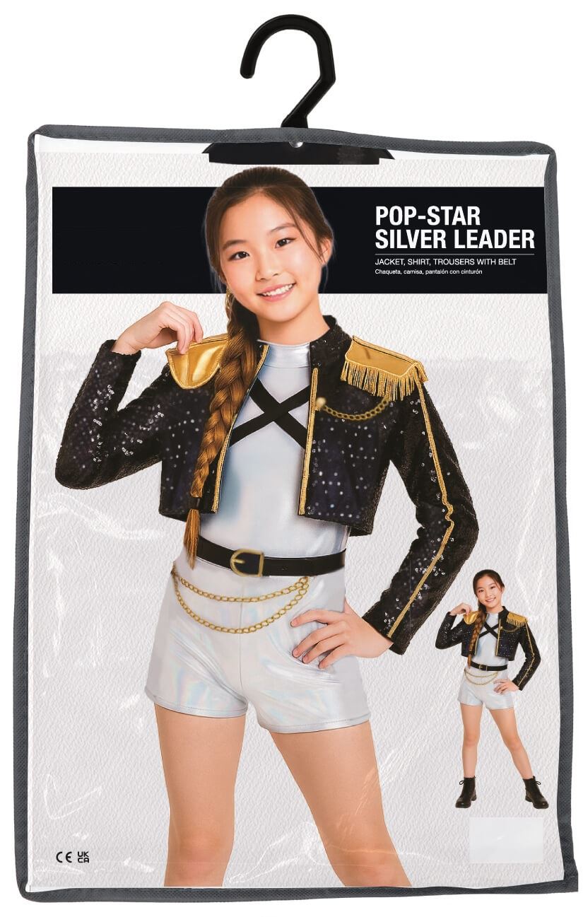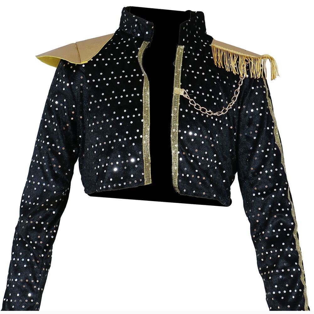 Este set incluye una chaqueta negra de lentejuelas con hombreras doradas y detalles metálicos, una camiseta plateada holográfica con tirantes cruzados, un pantalón corto de efecto metálico a juego, y un cinturón negro con hebilla dorada y cadenas decorativas, para completar un look digno de una líder del grupo.