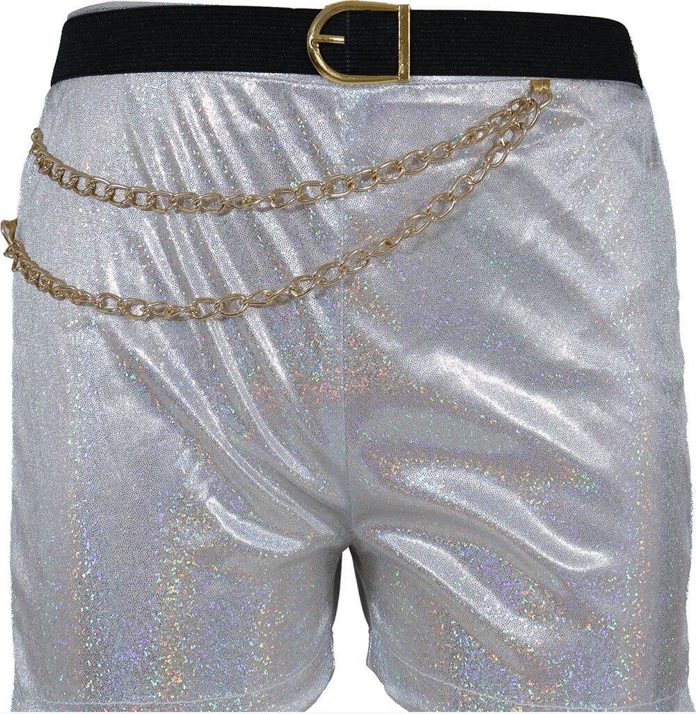 Chaqueta de lentejuelas, camiseta plateada con tirantes, pantalón corto plateado y cinturón decorativo con cadenas.