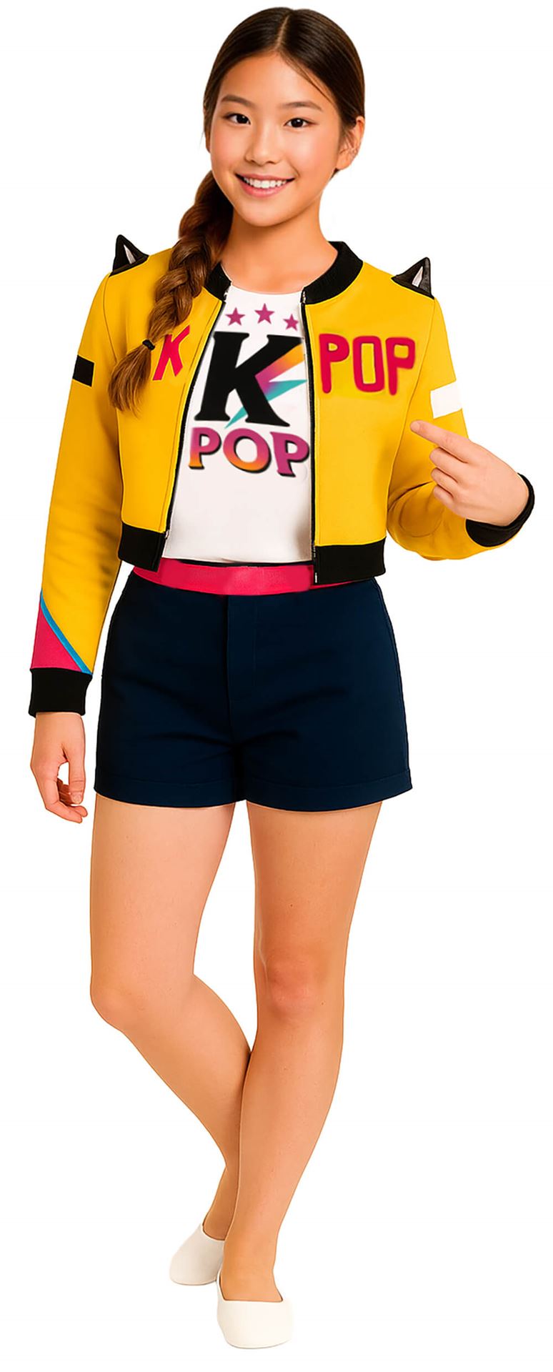 Este disfraz incluye una chaqueta amarilla con detalles de color, una camiseta blanca con el logo “K‑POP”, y un pantalón corto azul marino que recrean fielmente la energía y el estilo visual que Rumi muestra en sus escenas más dinámicas.