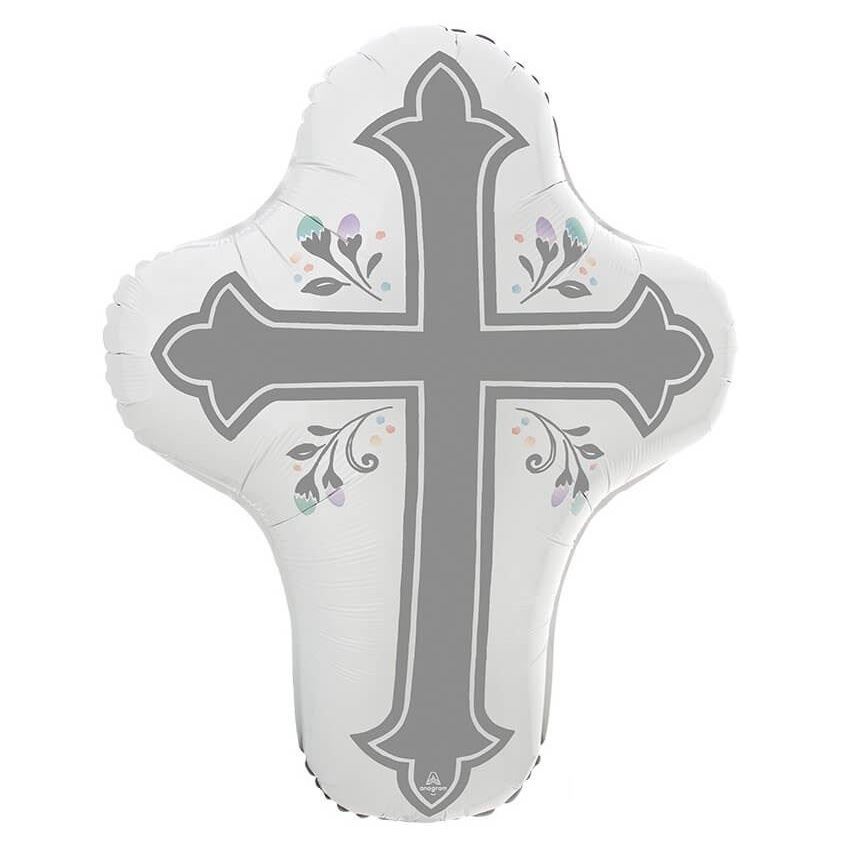 Añade este globo cruz plata a tu celebración y crea un ambiente sofisticado, armonioso y perfecto para Comunión o Bautizo.