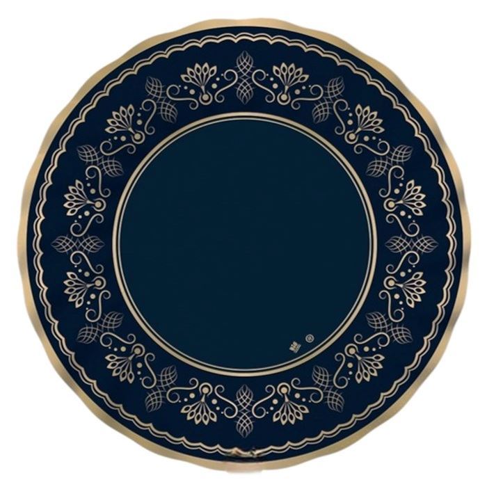 ✅ Cantidad: Pack de 6 unidades. ✅ Diámetro: 30 cm. ✅ Forma: Ondulada (wavy). ✅ Material: Cartón de alta calidad, 350 gr de gramaje, firme y resistente. ✅ Colores: Azul royal con estampado dorado en hot foil (oro a caliente), que resalta con un acabado brillante y elegante. ✅ Uso: Apto para comidas frías y calientes. ✅ Estilo: Perfectos para Navidad, Nochevieja, bodas o eventos formales.