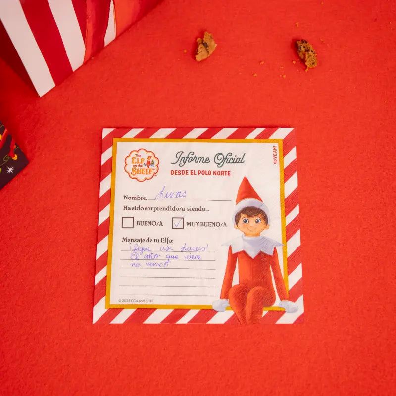 Convierte cada desayuno, merienda o cena navideña en una experiencia inolvidable con estas originales servilletas de papel con diseño de "Informe Oficial desde el Polo Norte". Ideales para niños y familias que celebran la tradición del Elf on the Shelf, estas servilletas no solo decoran tu mesa, sino que se integran como parte activa del juego con el elfo.