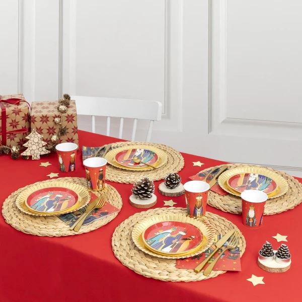 Estas servilletas de Reyes Magos son una elección encantadora para decorar tu mesa en la temporada navideña. Cada servilleta muestra a los Reyes Magos viajando en sus camellos a través de un hermoso paisaje de fondo. Son de papel, tienen un tamaño de 33 cm y vienen en un paquete de 30 unidades. Estas servilletas temáticas añadirán un toque festivo y mágico a tus comidas y celebraciones navideñas mientras rindes homenaje a esta tradicional historia.