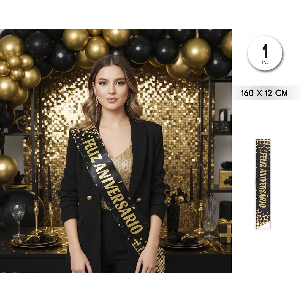 La banda Feliz Aniversario negra y dorada (160 x 12 cm) es el complemento perfecto para destacar al protagonista en cumpleaños y celebraciones especiales. Con diseño elegante en negro con detalles dorados, aporta un toque sofisticado a cualquier fiesta de aniversario.