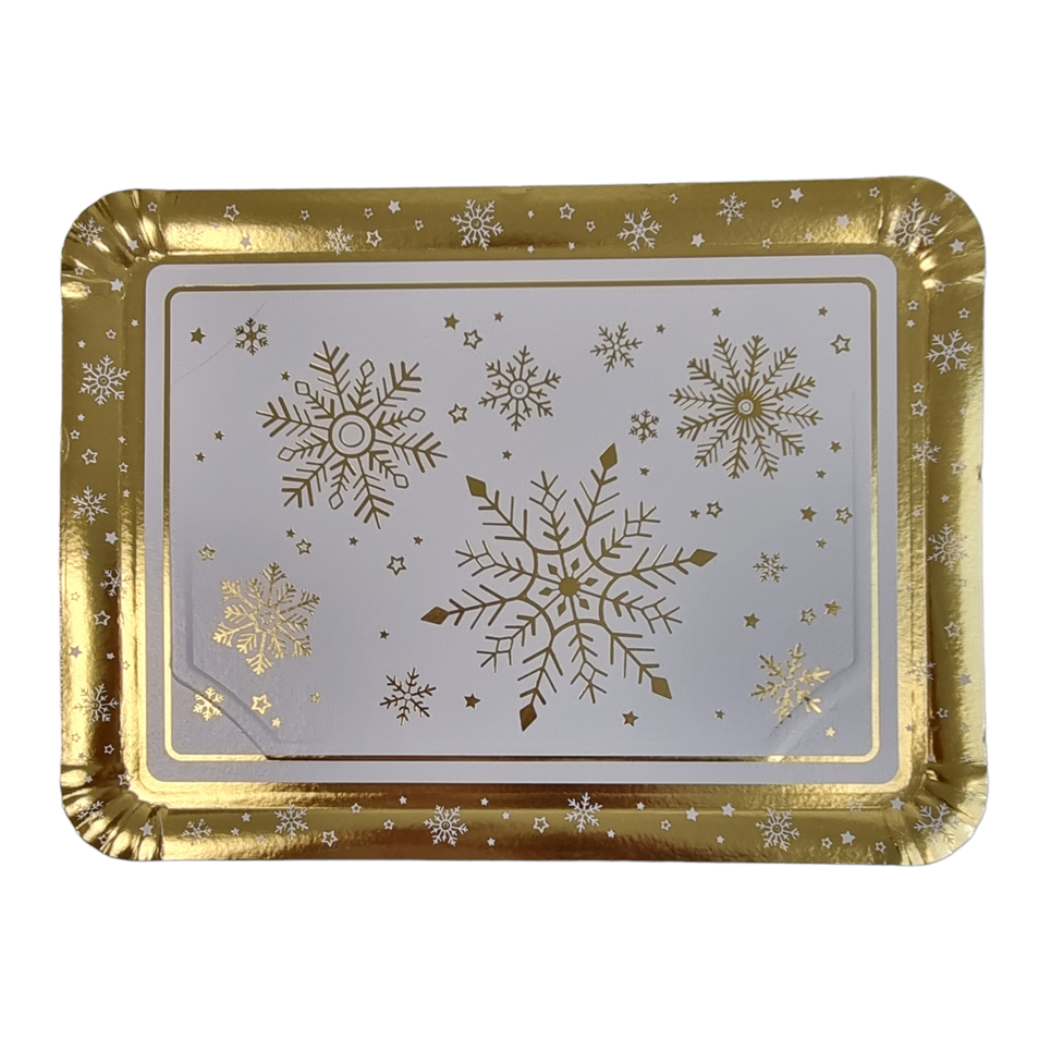 Bandeja de Navidad Copo de Nieve Oro. Con un elegante diseño de copo de nieve dorado sobre cartón resistente, esta bandeja es perfecta para servir tus deliciosos platos y aperitivos durante las celebraciones navideñas. Su tamaño de 34 cm x 25 cm la hace ideal para presentar exquisiteces y postres de manera elegante. Añade un toque de brillo dorado a tu mesa y crea recuerdos festivos inolvidables con esta encantadora bandeja. ¡Haz que tus celebraciones navideñas brillen con esta pieza decorativa y funcional!