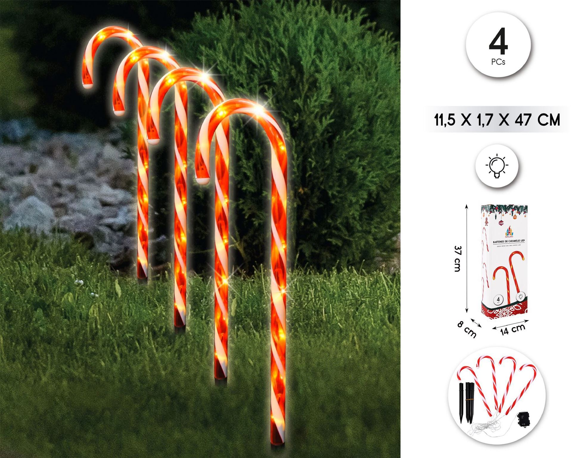Ilumina tu jardín, terraza o entrada con estos preciosos bastones de caramelo LED de 47 cm, un set de 4 piezas ideal para crear un camino navideño lleno de magia. Su diseño rojo y blanco, junto con su luz cálida decorativa, aporta un ambiente festivo instantáneo. Estos bastones LED están pensados para clavarse fácilmente en césped, tierra o maceteros. Cada unidad reproduce el clásico bastón navideño y se ilumina con luces integradas, perfectas para destacar senderos, bordes de jardín y espacios exteriores. Son resistentes, fáciles de instalar y muy vistosos tanto de día como de noche.