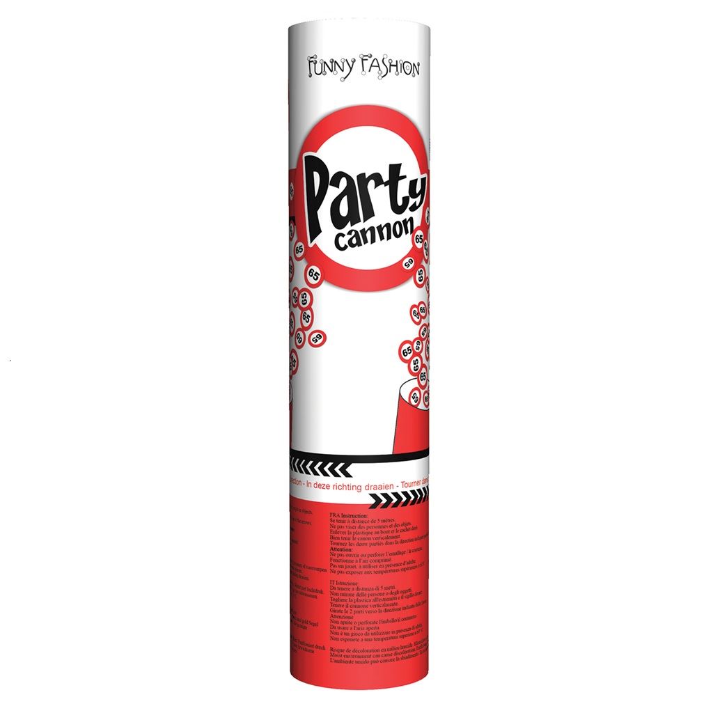 Este confetti shooter de 20 cm para 65 años lanza una lluvia de confeti en forma de señales de tráfico con el número 65 en el centro, simulando los clásicos carteles de velocidad. Su uso es sencillo: basta con girar la base del tubo para liberar el contenido con aire comprimido, creando un efecto visual divertido y seguro.