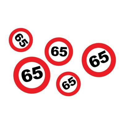 Confeti de papel en forma de señales de tráfico con el número 65, en varios tamaños.