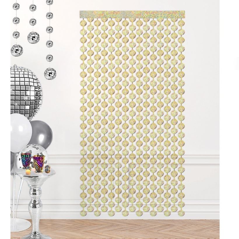 Esta cortina decorativa de 2 metros de alto por 1 metro de ancho destaca por su diseño con esferas tipo bola de discoteca en acabado dorado. Aporta un efecto luminoso y festivo perfecto para cumpleaños, Nochevieja, fiestas disco, bodas o celebraciones temáticas.