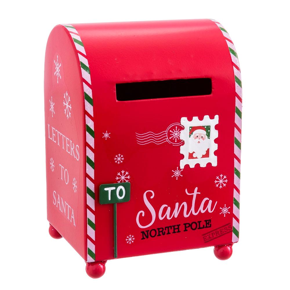 Decorado Buzón Papá Noel de Metal de tamaño de 19cm x 14cm x 13cm. De color rojo. No le falta detalle.