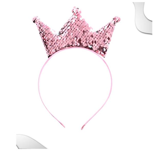 La corona está cubierta con lentejuelas rosadas que reflejan la luz y le dan un toque especial y mágico. El diseño ligero y flexible de la diadema asegura un ajuste cómodo, ideal para usar durante horas en cualquier ocasión especial.