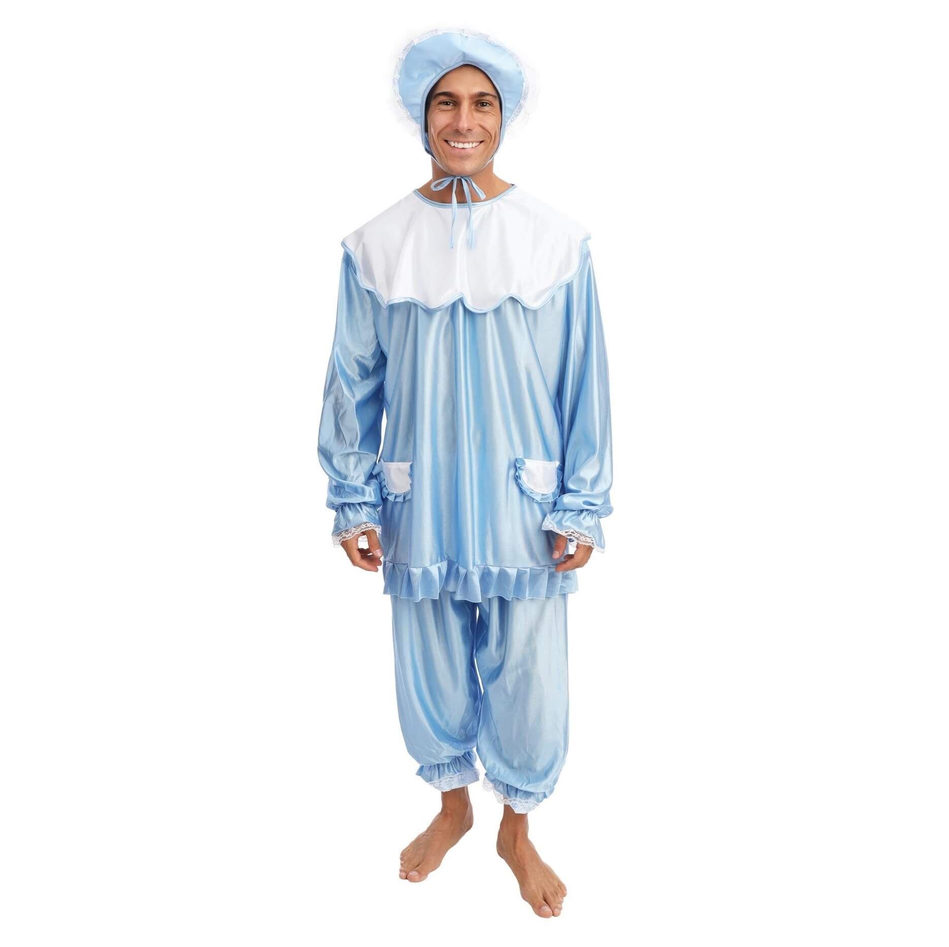 ✔️ Gorro de bebé con encaje y lazito, para un toque adorable.✔️ Blusa azul con cuello blanco y detalles en encaje, imitando un clásico conjunto infantil.✔️ Pantalones bombachos, cómodos y holgados, con elástico en los tobillos para un ajuste perfecto.