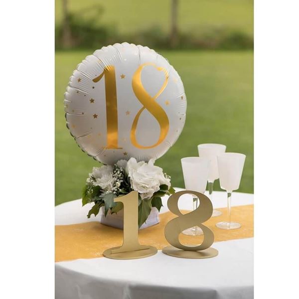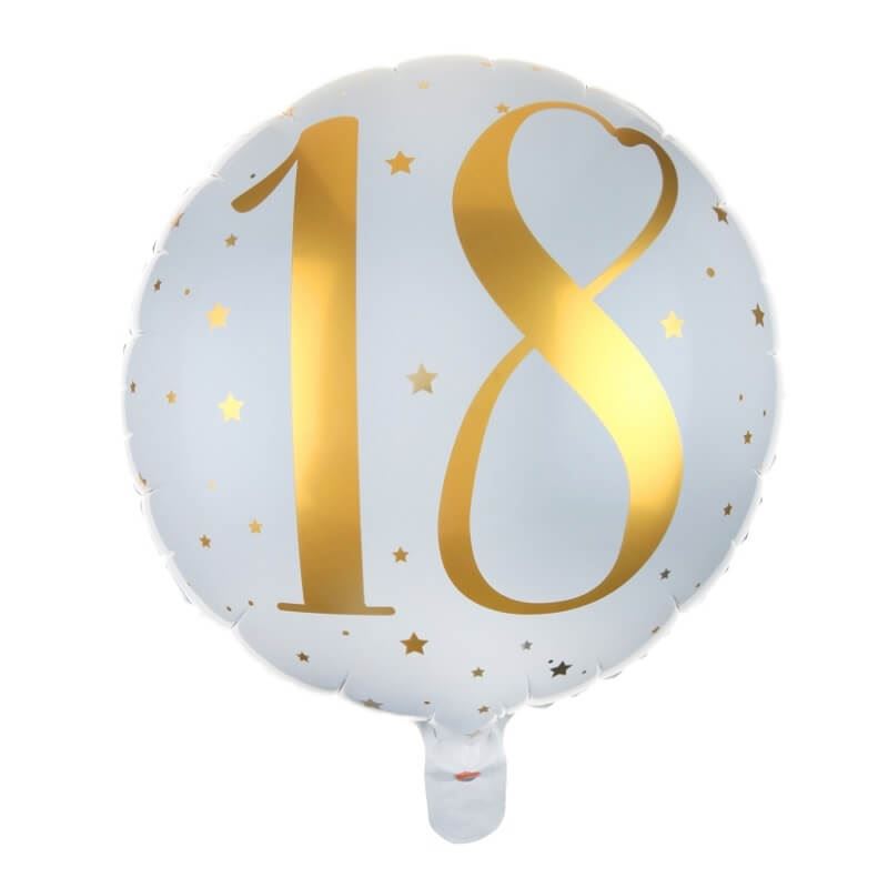 Globo foil 18 años en color blanco con el número en dorado, de 45cm. Un globo super chulo para decorar una fiesta de alguien especial que cumpla 18 años. A un precio increíble. Combínalo con globos lisos para hacer un bouquet. Se puede inflar con helio o aire.* *Se envia sin inflar**