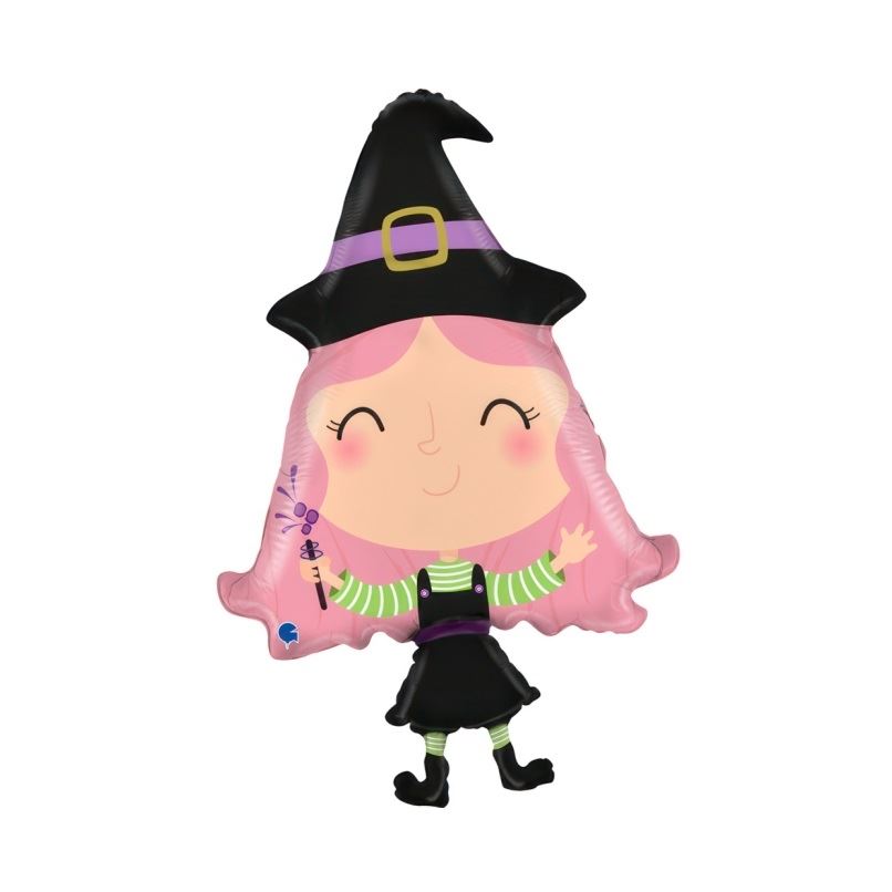 Globo Brujita Adorable foil 79cm x 53cm Este globo de bruja mide 79 cm y es una excelente opción para decorar fiestas temáticas de Halloween. Con su diseño divertido y encantador de una bruja con pelo rosa, es perfecto para crear un ambiente amigable y alegre en celebraciones tanto para niños como para adultos. Su tamaño lo hace ideal como pieza central o complemento para decorar espacios amplios. Además, es fácil de combinar con otros elementos de la fiesta. ¡Haz que tu celebración sea inolvidable con este adorable globo de bruja!