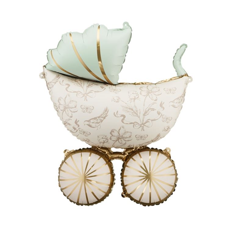 Este precioso globo metalizado con forma de cochecito de bebé es el toque ideal para decorar tu baby shower, la bienvenida al hospital o una sesión de fotos de embarazo. Su diseño combina tonos suaves —mint, blanco y dorado— con ilustraciones florales en estilo clásico, aportando una estética sofisticada y tierna a cualquier ambiente.