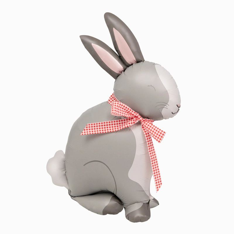 El conejo presenta un acabado en tonos suaves y naturales, con detalles cuidados que aportan un efecto tierno y decorativo. Al tratarse de un globo de pie, se mantiene estable una vez inflado con aire, sin necesidad de helio, lo que lo hace práctico y seguro para interiores.