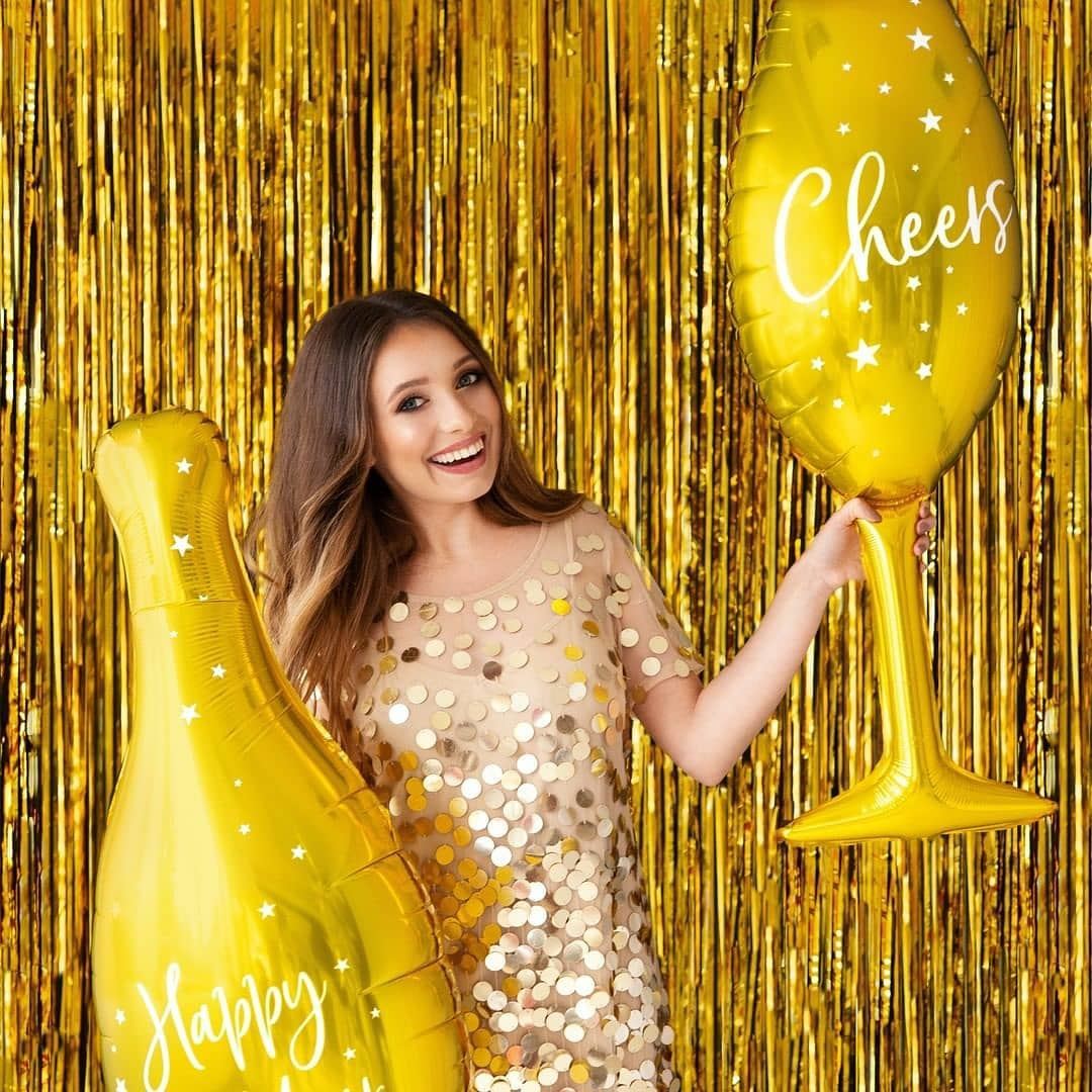 Globo de foil con forma de copa de champagne y la palabra en inglés "Cheers"(salud) de color dorado brillante. Perfecto para decorar cualquier tipo de celebraciones especiales, navidad, nochevieja, bodas, aniversarios, cumpleaños, etc. Apto para aire y helio. Se vende sin inflar. Mide aprox. 80cm x 28cm