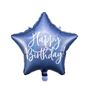 Globo de foil brillante en forma de estrella en color azul marino con inscripción iridiscente Happy Birthday, tamaño antes de inflar aprox. 47 cm (18,5''), tamaño después del inflado aprox. 40 cm (15,5''). Inflar con helio o aire.