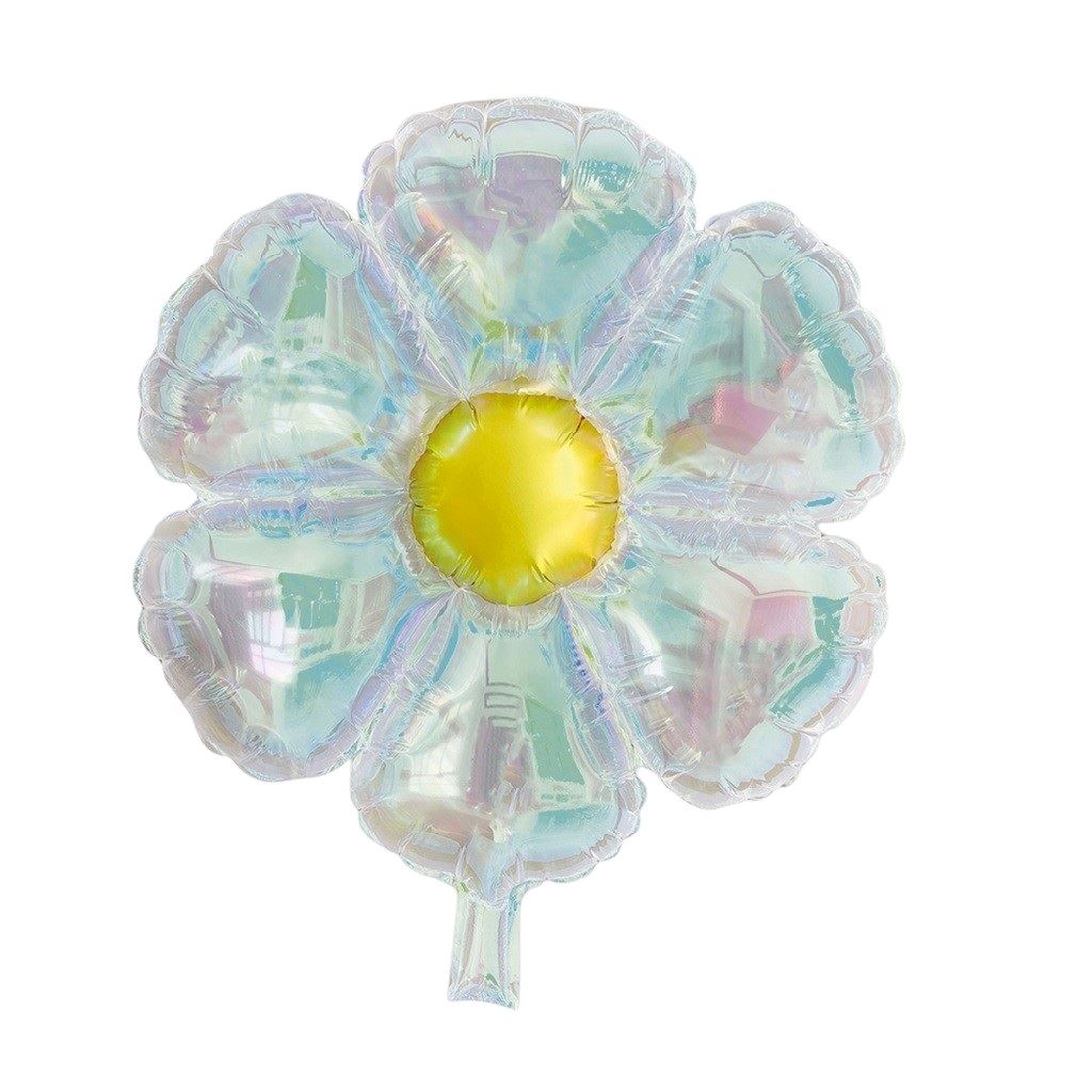 El globo flor transparente iridiscente es un globo decorativo de gran tamaño con efecto nacarado que refleja la luz en tonos pastel. Su diseño en forma de flor con centro amarillo lo convierte en un elemento visual muy llamativo para decorar fiestas elegantes, baby showers, comuniones, cumpleaños o eventos primaverales.