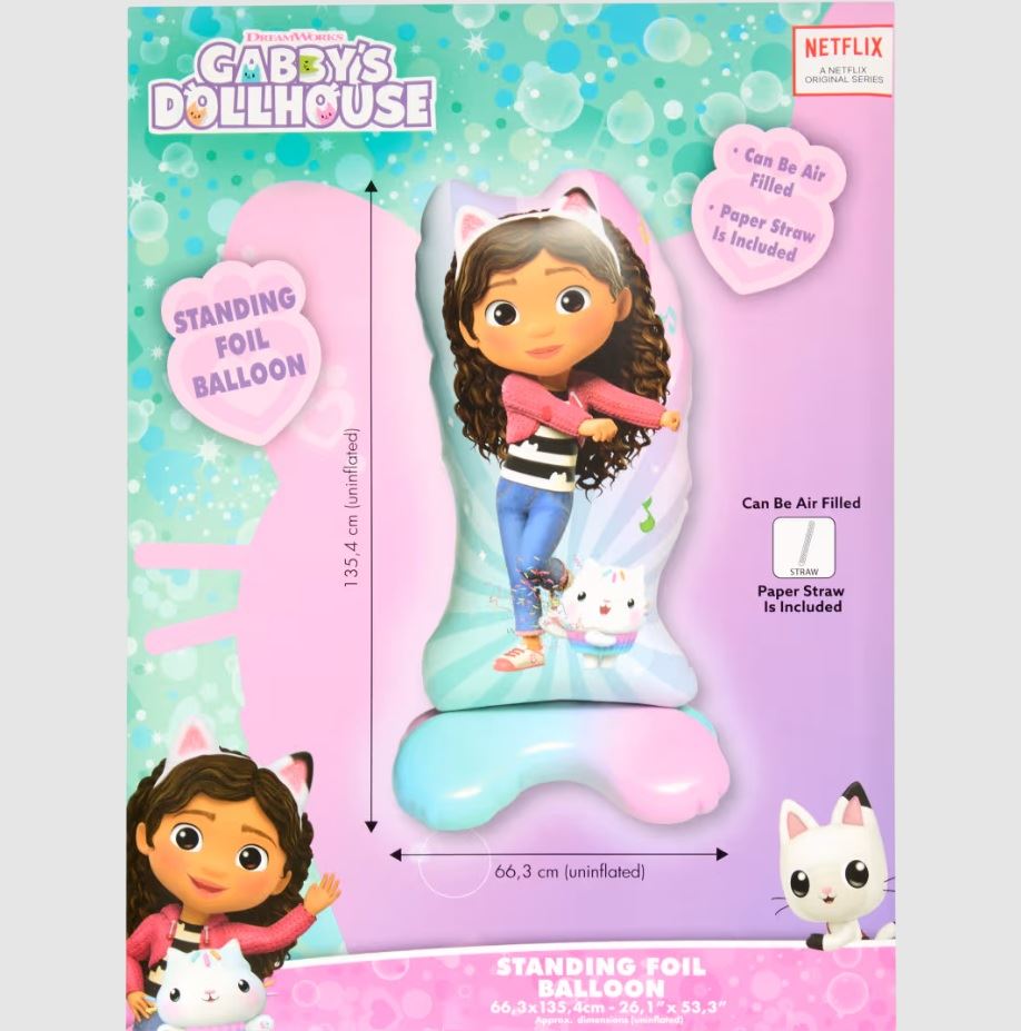 Crea una zona mágica con temática Gabby: Combina este globo de pie con otros globos en tonos pastel, vajilla desechable con diseños de la serie, y una mesa dulce con cupcakes decorados. Coloca el globo en la entrada o junto a la tarta para una bienvenida inolvidable. ¡Ideal para niñas fan de esta serie de Netflix!