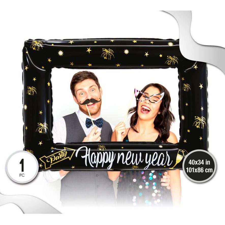 El globo foil en forma de marco “Happy New Year” es el accesorio imprescindible para crear fotos divertidas, elegantes y memorables en tu fiesta de fin de año. Su diseño en negro con detalles dorados y su gran tamaño lo convierten en el punto focal perfecto para cualquier celebración de Año Nuevo. Ideal para photocalls, cenas especiales, cotillones, fiestas en casa o eventos corporativos.