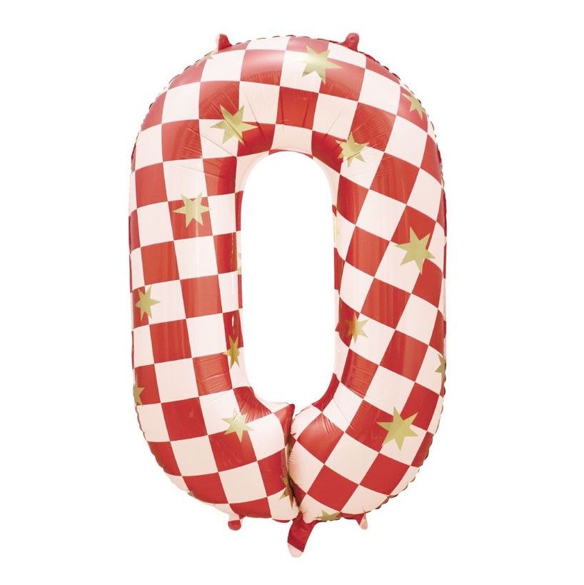 Dale un toque llamativo y diferente a tu celebración con el Globo Número 0 gigante de cuadros rojos y estrellas.