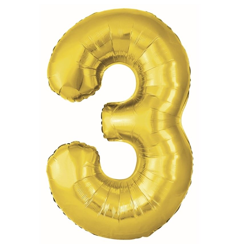 Globo Foil Nº 3 Oro 86 cm. Decoración elegante para cumpleaños y celebraciones. Inflable con aire o helio. Perfecto para combinar con otros números. Disponible en FiestaFácil.