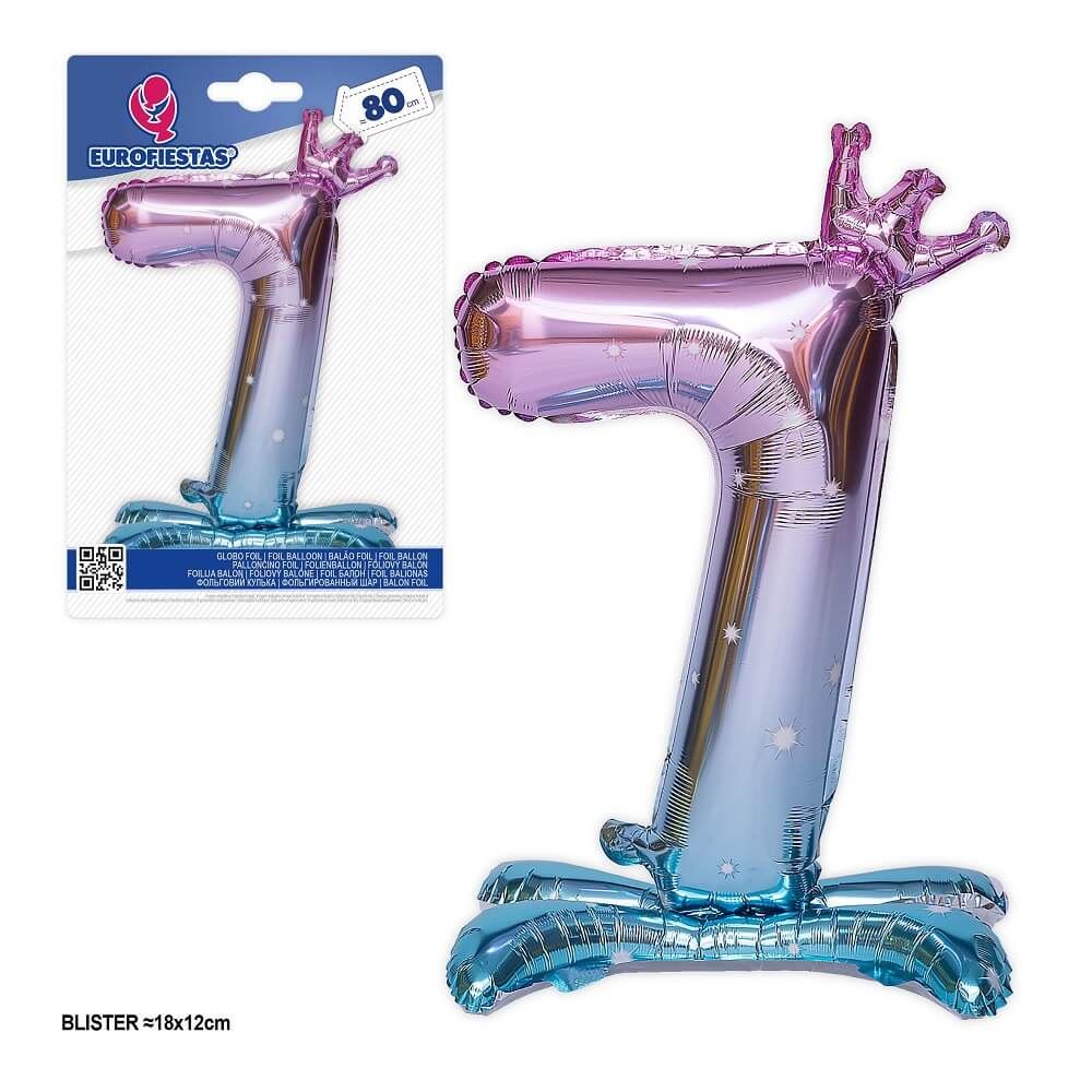 Globo de foil con Base Número 7 de color azul y rosa. Mide 80. Se mantiene de pie solo con aire. No necesita helio. Viene con una corona que lo hace ideal y decorativo. Solo se infla con aire . NO con Helio.