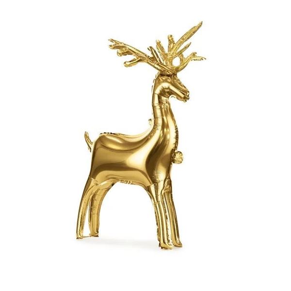 Reno dorado de globo foil que se mantiene de pie. Se infla con aire y trae pajita. Tamaño inflado 73 × 42 cm. Ideal para decorar entradas, mesas y fotos en Navidad. Reutilizable si lo desinflas y guardas en seco.