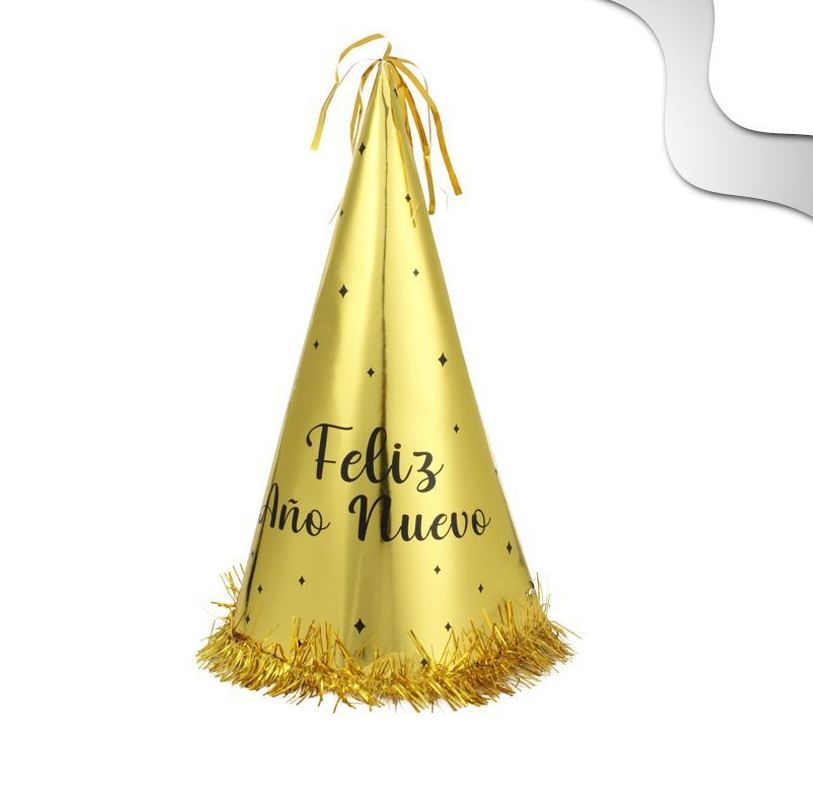 Celebra la llegada del Año Nuevo con estilo, brillo y mucha diversión gracias a este gorro de fiesta dorado metalizado, perfecto para ambientar cualquier celebración. Su diseño elegante y festivo convierte cada fotografía y cada brindis en un momento inolvidable. Fiestas de Nochevieja en casa, bares, restaurantes y eventos corporativos. Photocalls, cotillones y celebraciones temáticas. Complementar bolsas de cotillón y kits de fin de año. ¿Viene empaquetado individualmente? Sí, se vende por unidad, ideal para añadir la cantidad exacta que necesites.