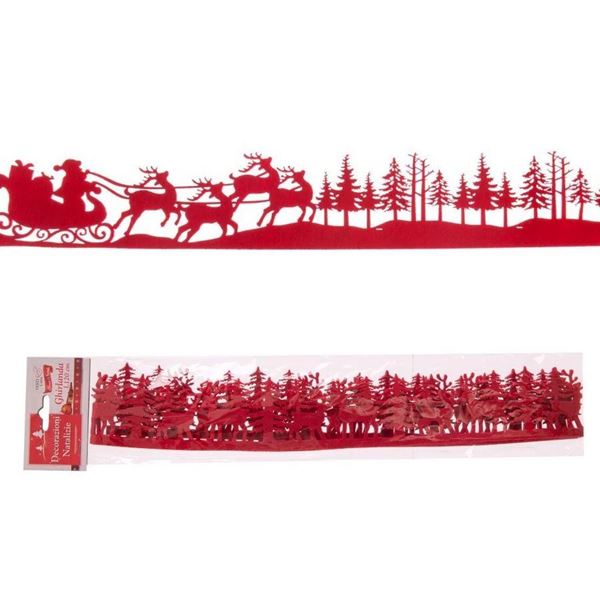 Dos guirnaldas de fieltro rojo. Una de renos en el bosque y la otra de Papá Noel en su trineo. Ideales para decorar en Navidad. Mide en total 1,2 metros de largo por 9cm de alto. Son ideales para decorar en Navidad.