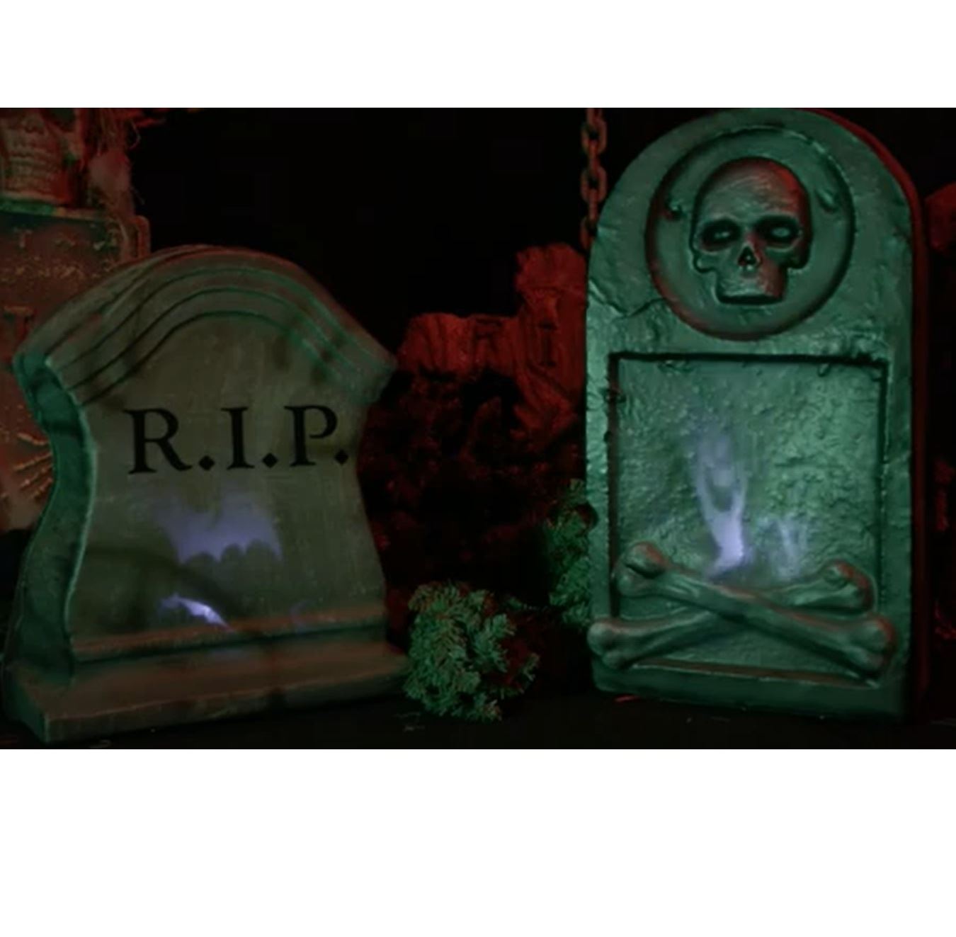 ¡Sorprende a tus invitados con estas lápidas realistas y sus increíbles efectos de luz y sonido! Haz que tu decoración de Halloween sea inolvidable.