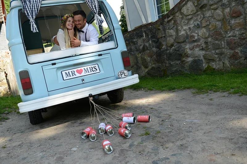Pack de 5 latas metálicas con cuerda de yute, estilo retro para decorar el coche de los novios. Ideal para bodas vintage, boho o románticas. Tamaño 14 x 7 cm.