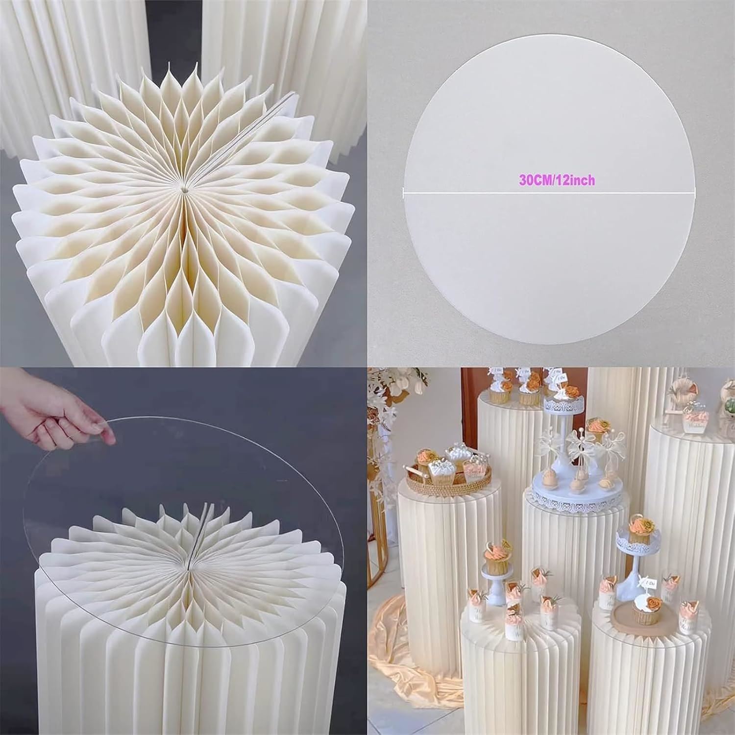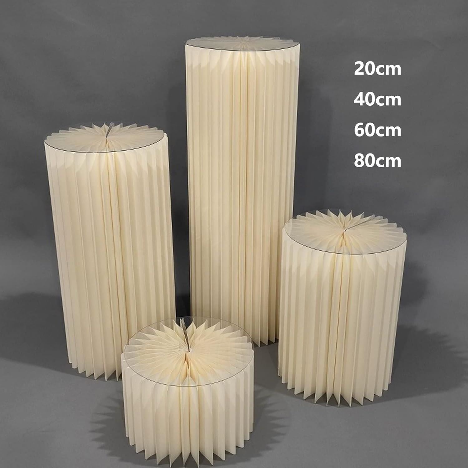 ¡Eleva la decoración de tu evento con estos elegantes pedestales plegables de papel crepé en tono crema! Perfectos para bodas, comuniones, bautizos o cualquier celebración que requiera un toque de distinción, estos pedestales crean un ambiente sofisticado y llamativo para exponer dulces, flores, adornos o incluso regalos.