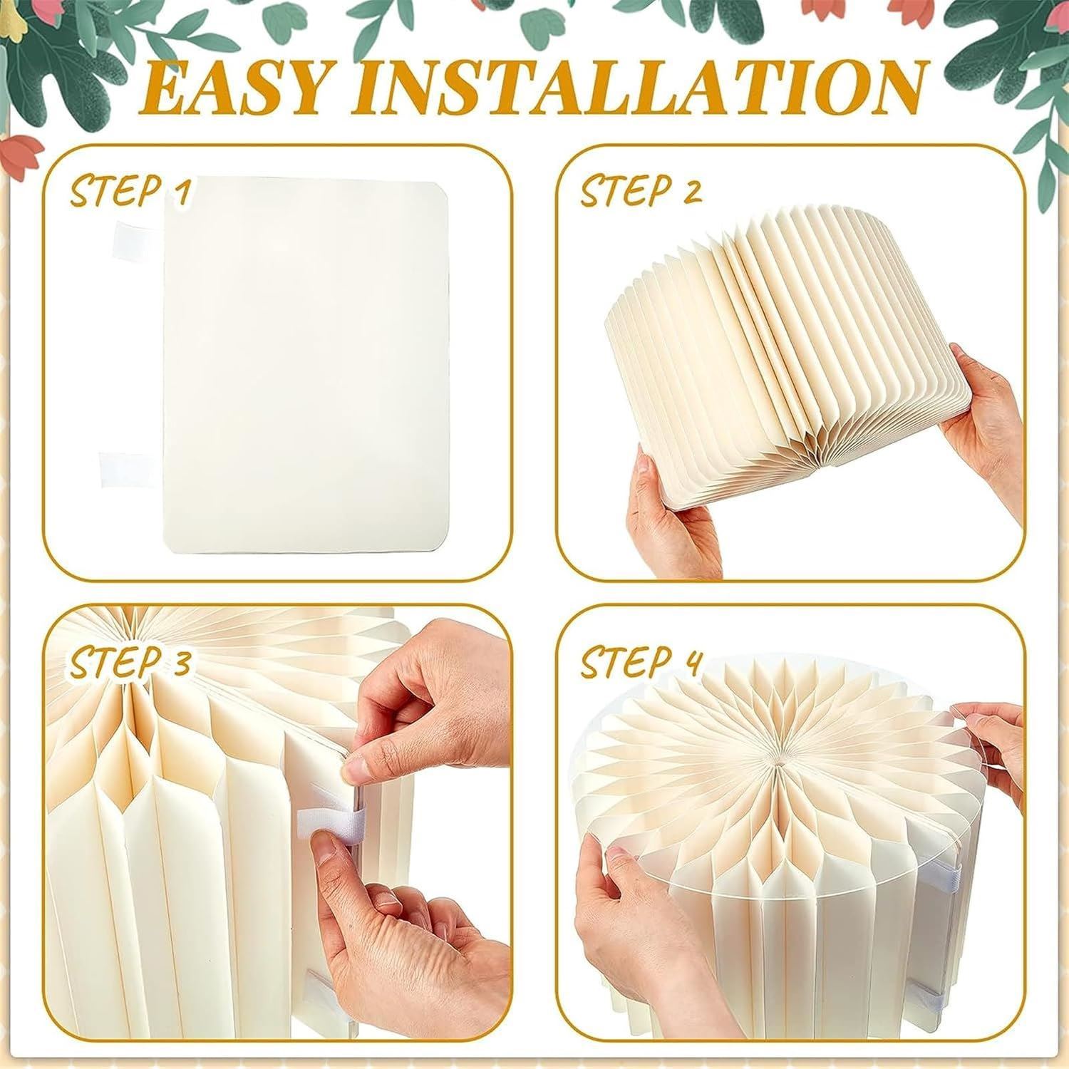 • Material: Papel crepé de alta calidad, resistente y fácil de plegar y desplegar. Trae un disco de metacrilato para la parte superior.