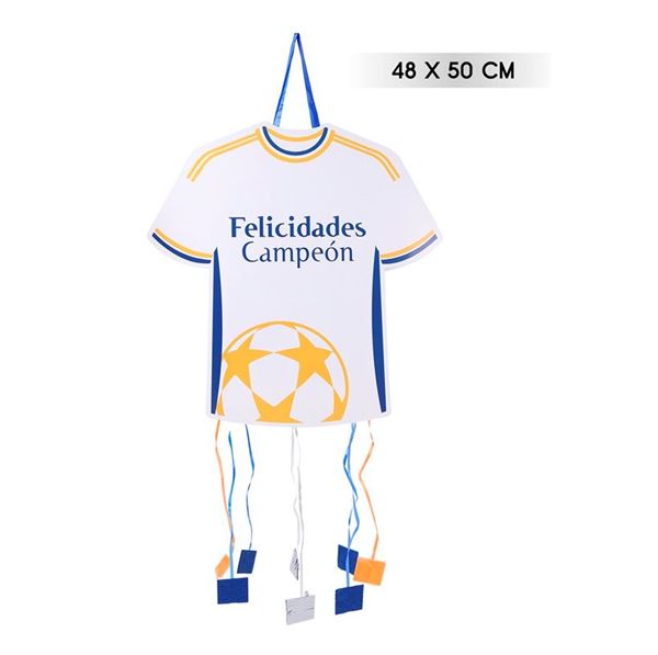 🏁 Piñata Real Madrid – Escudo Master (35×35 cm) Haz que tu fiesta vibre con esta piñata oficial del Real Madrid. Diseño con escudo del club y cintas para tirar, ideal para celebraciones con pasión blanca. Descripción general La piñata Real Madrid – Escudo Master añade emoción y espíritu madridista a tus celebraciones. Su formato clásico con cintas permite abrirla sin romperla, haciéndola ideal para interiores. Con un diseño centrado en el escudo oficial del club y decoraciones colgantes, es perfecta para cumpleaños, peñas o cualquier evento fan. Características técnicas Diseño: Escudo oficial Real Madrid en formato cuadrado Tamaño: 35 × 35 cm aprox. Sistema: Apertura con cintas (sin golpes) Decoración: Colgantes con mini escudos y cintas azul Real Madrid Material: Cartón rígido y papel decorativo Presentación: Blister 45×38 cm Licencia: Producto oficial Real Madrid CF Capacidad: Rellenable con chuches, juguetes, confeti o sorpresas Beneficios Estilo oficial para animar cualquier fiesta temática Apertura segura, ideal para niños Reutilizable como decoración mural Fácil de colgar y rellenar Preguntas frecuentes ¿Se puede reutilizar? Sí, gracias al sistema de apertura sin romper. ¿Tiene licencia oficial? Sí, es un producto con escudo aprobado por Real Madrid CF. ¿Para qué edades es adecuada? Ideal para fiestas infantiles, juveniles y eventos de peñas. Cómo combinar Mantel, vasos y platos oficiales Real Madrid Globos del escudo en azul o dorado Cajas de chuches o palomitas temáticas
