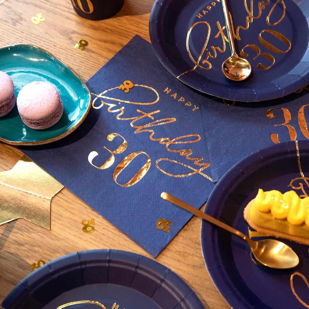 Servilletas Azul "Happy Birthday 30" - 10 Uds 🎉✨ Celebra tus 30 años con estas exclusivas servilletas en color azul marino con detalles en dorado metalizado. Diseñadas especialmente para destacar en cualquier fiesta, aportan un toque elegante y moderno a la decoración de tu evento. ¡Perfectas para realzar este momento tan especial! Características principales: Diseño premium: Impresas con la frase "Happy Birthday 30" en dorado brillante, ideales para un cumpleaños inolvidable. Tamaño ideal: Cada servilleta mide 33 x 33 cm desplegada, ofreciendo un equilibrio perfecto entre funcionalidad y estilo. Alta calidad: Fabricadas en papel de 3 capas, garantizando resistencia y un acabado lujoso. Paquete práctico: Incluye 10 unidades, ideales para complementar tu mesa o candy bar. Ventajas del producto: Estilo sofisticado: Los detalles dorados destacan en cualquier ambiente, creando una atmósfera festiva y refinada. Fácil de combinar: Perfectas para coordinar con otros artículos en tonos dorados, azules o neutros. Prácticas y decorativas: No solo útiles para servir, sino también para complementar la decoración de tu mesa. Consejos de uso: Combínalas con platos y vasos a juego de la misma colección para una decoración temática impecable. Añade elementos dorados como confeti o globos metálicos para un look más glamuroso. Coloca las servilletas en los puestos de cada invitado o úsalas en tu buffet para destacar los detalles de tu fiesta. 🎂 ¡Dale la bienvenida a tus 30 con estilo y celebra como te mereces con estas elegantes servilletas!