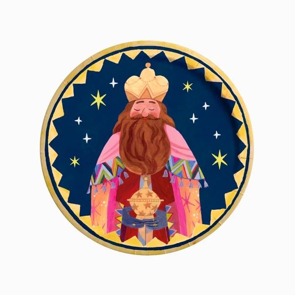 Descripción del producto Platos de cartón de Ø 23 cm con ilustraciones exclusivas de los Reyes Magos (Melchor, Gaspar y Baltasar). Diseñados en colores vivos y detalles dorados, son perfectos para celebrar la víspera de Reyes, desayunos familiares, meriendas después de la cabalgata o cualquier mesa temática navideña.
