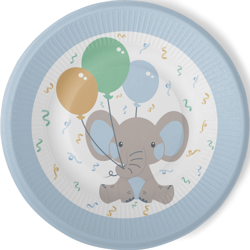 8 platos de cartón con un diseño infantil de un elefante con globos. Un dulce plato en tonos azules perfecto para cumpleaños infantiles o babyshower. Mide 23cm.