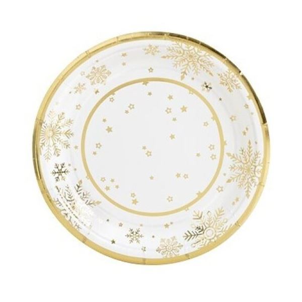 Platos Golden Snow cartón 18cm (8 Uds.) Color dorado. Añade un toque de glamour a tu mesa y crea momentos especiales durante la temporada festiva con estos hermosos platos Golden Snow. ¡Decora con estilo y celebra la magia de la Navidad!