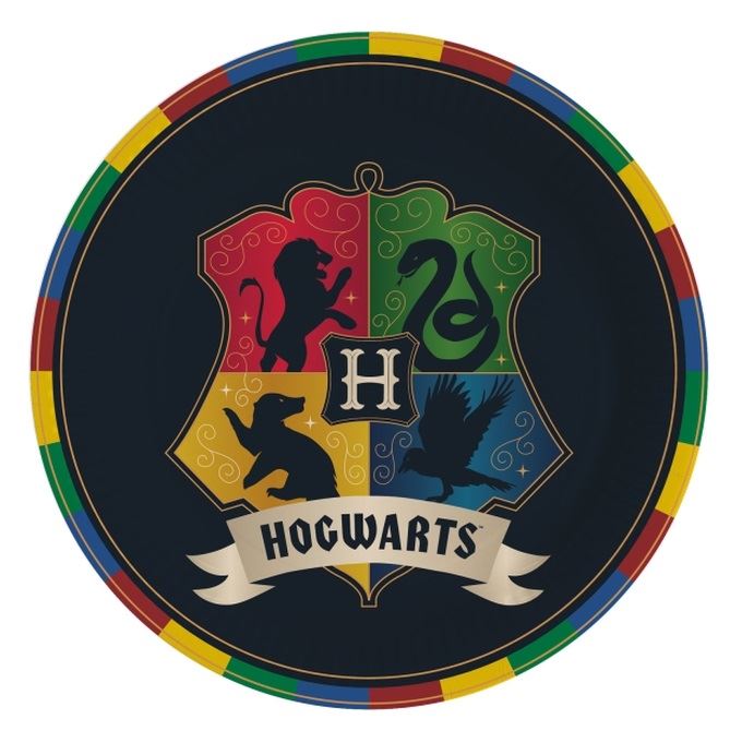 Platos Harry Potter grandes. Platos que traen un diseño con las ilustraciones de las casas de Hogwarts. Contiene el pack 8 unidades. Miden aprox. 23cm