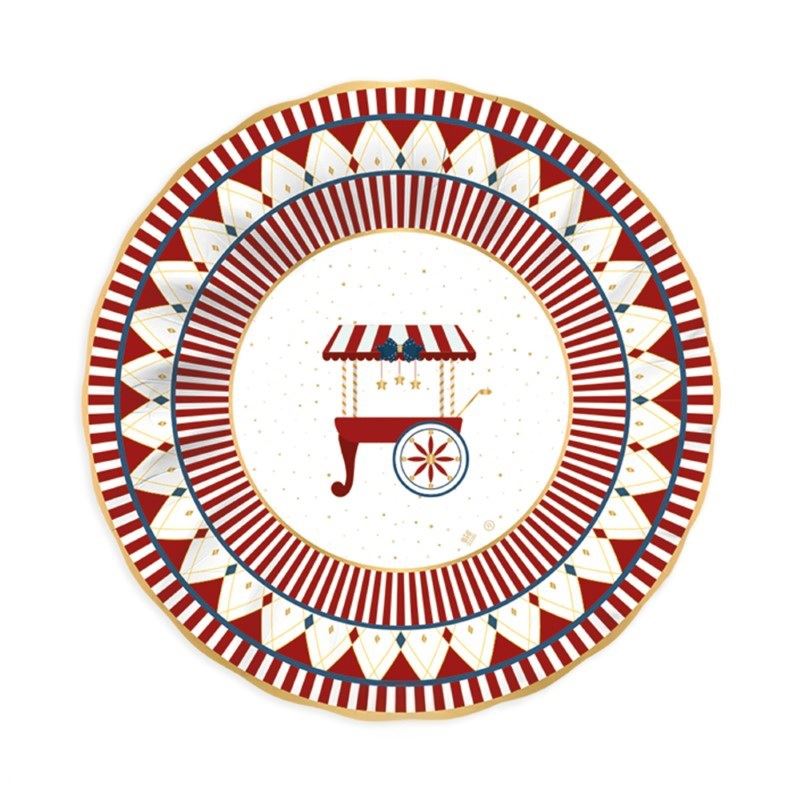 Los platos de 24 cm de la colección Christmas Carousel son una pieza protagonista para cualquier mesa navideña. Su diseño muestra un carrito ambulante de mercadillo Navideño rodeado por un borde festivo en tonos rojo, crema, azul noche y dorado, creando una estética cálida y elegante inspirada en la magia de los parques navideños tradicionales. Su tamaño extra grande es perfecto para servir platos principales abundantes, bandejas de dulces o presentaciones especiales durante tus celebraciones.