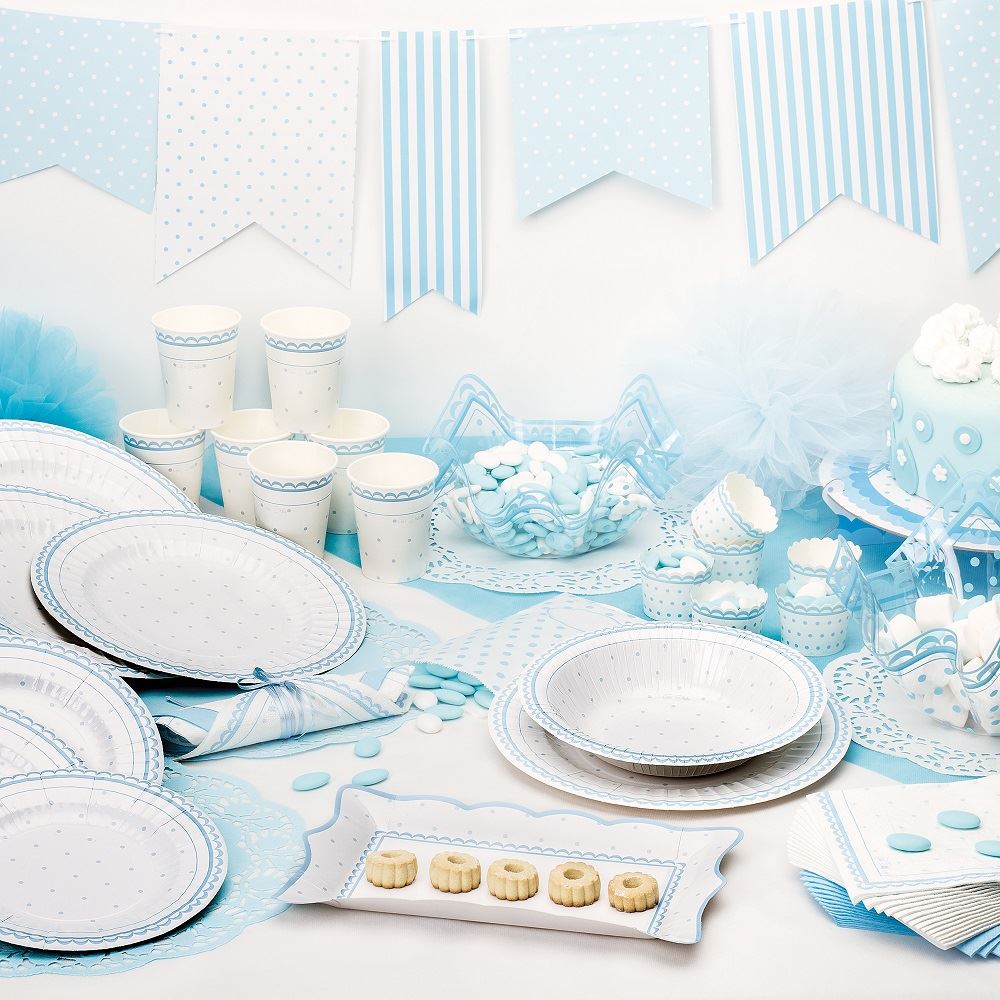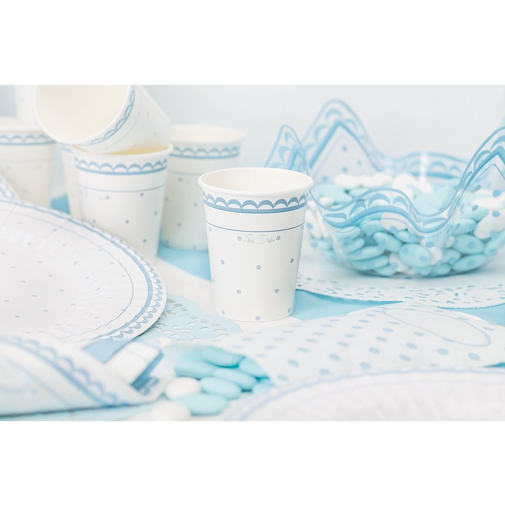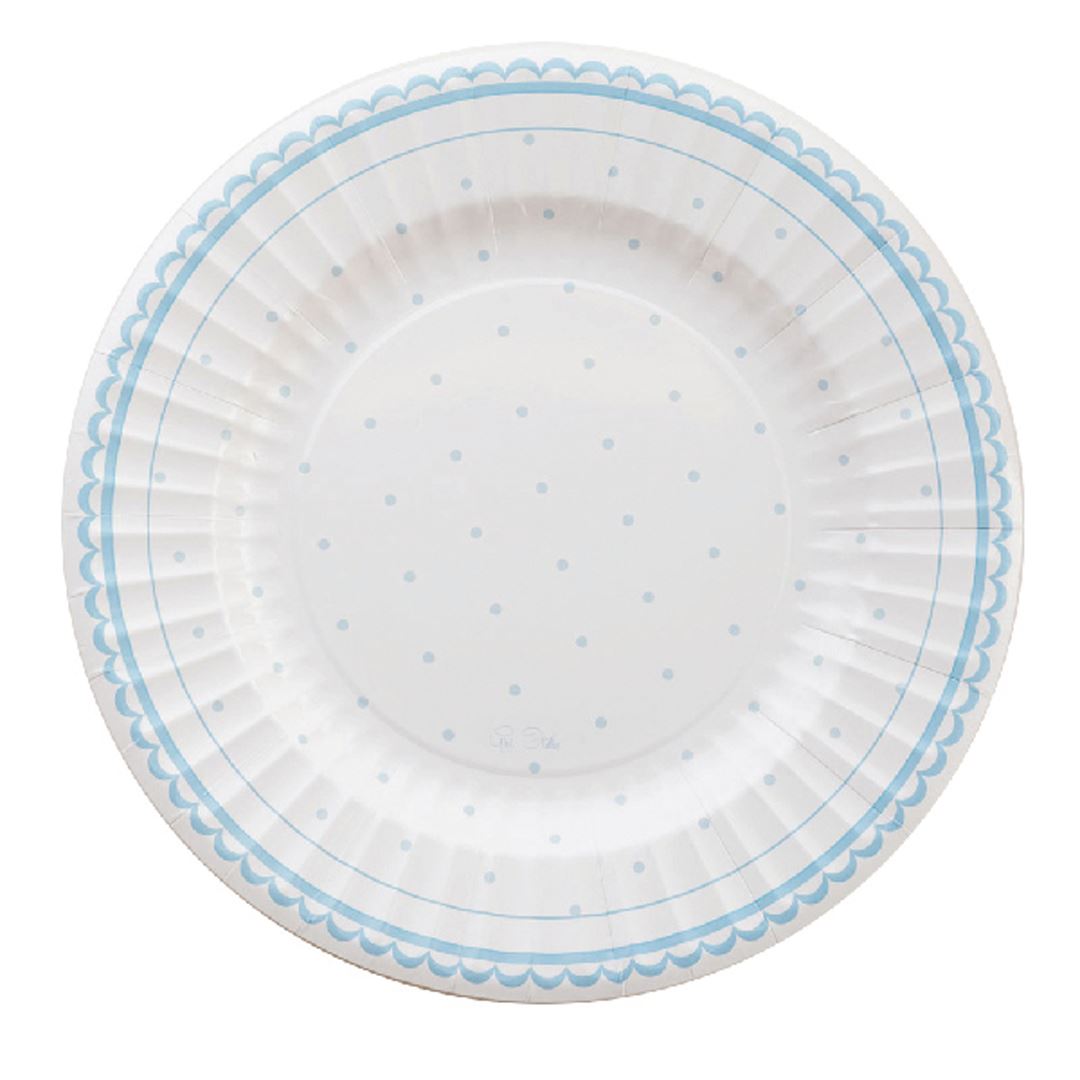Platos de cartón en color blanco con lunares en azul pastel. Miden aprox. 21cm de diámetro. De diseño italiano atractivos y elegantes, ideales para celebrar el Primer Cumple, Bautizos, etc. Son biodegradables, cumpliendo con la normativa ISO 14855-1:2005. Contiene 8 unidades.