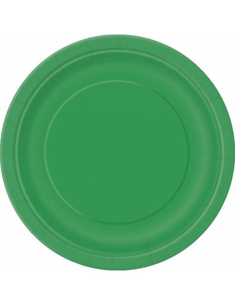 Platos de cartón de color verde. Miden 18cm de diámetro. Paquete de 8 platos.