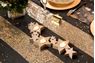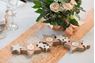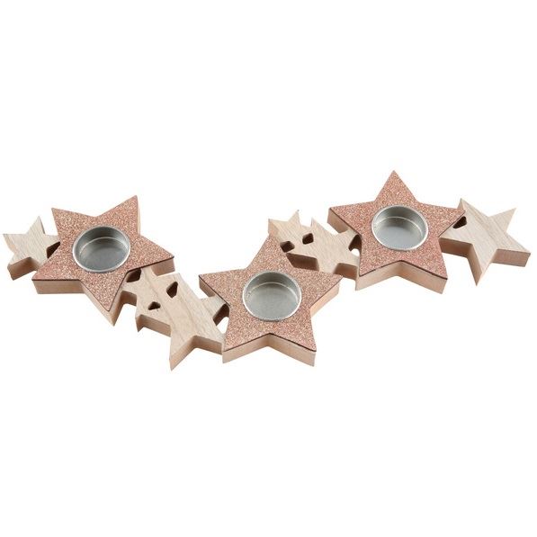 Portavelas de madera en forma de estrellas enlazadas con un toque rosa dorado metálico en la base. Mide 40cm x 13cm x 2cm. Ilumina tu velada especial, navideña o romántica con este stand de madera precioso y muy original. Disponible en varios colores.