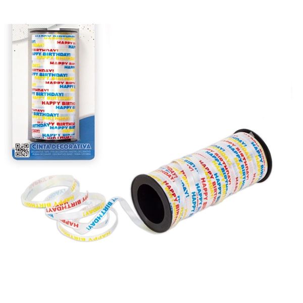 Este Rollo de Cinta "Happy Birthday" de 5 mm de ancho y 90 metros de longitud es el complemento perfecto para tus decoraciones de cumpleaños y eventos especiales. Con esta cinta, podrás atar globos, crear guirnaldas, y dar un toque festivo a tus celebraciones. La cinta está decorada con la frase "Happy Birthday" en un diseño festivo que añadirá un toque alegre a tus decoraciones