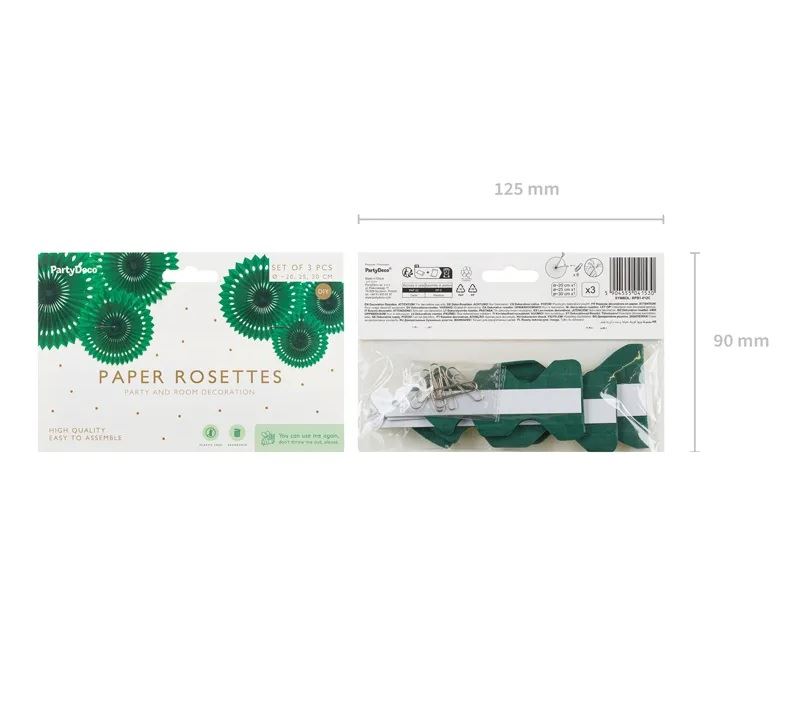 Dale a tu fiesta un aire fresco y elegante con este set de rosetones decorativos en color verde oscuro. El paquete incluye 3 rosetones de distintos tamaños (20 cm, 25 cm y 30 cm), perfectos para cualquier evento que busque destacar con una decoración natural y sofisticada.