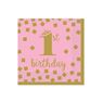 Servilletas originales de color rosa con detalles dorados. Lleva un dibujo de un 1 añito con corona. Son preciosas para acompañar a un trozo de pastel de cumpleaños. Miden 25cm x 25c. El pack contiene 16 unidades.