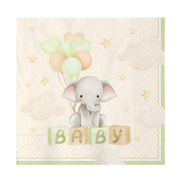 Estas adorables servilletas con diseño de elefantito, globos pastel y bloques BABY son el complemento perfecto para tu Baby Shower, bautizo o primer cumpleaños. 🐘✨